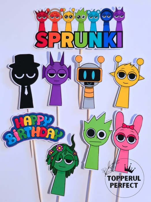 Toppere tort Sprunki, ideale pentru decor tort copii si aniversari. Design vesel si creativ, perfect pentru petreceri tematice inspirate din muzica si joc.