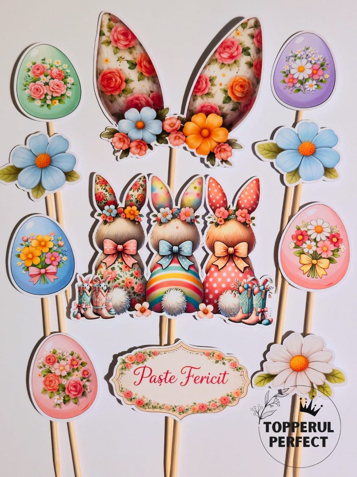 Folosite ca decor tort Paste, aceste toppere tort cu silueta iepurasi sunt perfecte pentru cei care cauta toppere tort tematice Paste, decor tort primavara si decoratiuni tort care sa ofere un aspect stilizat si armonios desertului.