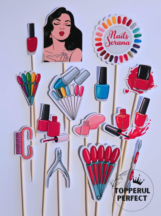 Folosite ca decor tort aniversar, aceste toppere tort nail artist se integreaza perfect in decoratiuni tort feminine si adauga un plus de stil si personalitate. Sunt ideale pentru cei care cauta toppere tort personalizate, decor tort tematic beauty sau toppere tort femei cu design rafinat.