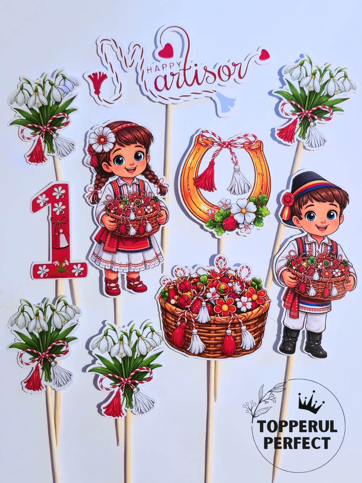 Topperele sunt ideale pentru decor tort 1 martie, fiind inspirate din elemente specifice acestui moment: flori delicate, ghiocei, lalele, trandafiri, fluturi, simboluri feminine, inimioare sau mesaje precum „La multi ani”, „Primavara frumoasa” sau „1 Martie”. Aceste toppere tort 1 martie pot fi simple sau elegante, minimaliste sau decorative, potrivite atat pentru torturi mici, cat si pentru torturi festive de eveniment.