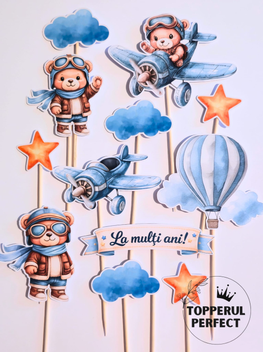 Folosite ca decor tort copii, aceste toppere tort urs aviator sunt ideale pentru parintii care cauta toppere tort tematice, decor tort botez baiat si decoratiuni tort care sa creeze o atmosfera calda si memorabila.